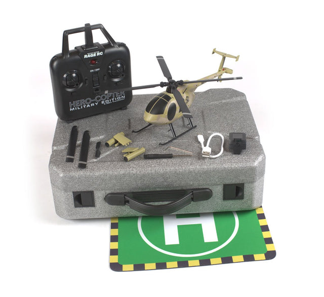The Hero-Copter Military Edition is the next Rage RC helicopter that takes the ease of flying a micro heli to a whole new level. This new scale-like heli is equipped with all the features that make RC drones easy to fly, such as 6-axis flight control, auto take-off and land, altitude hold, plus three flight modes (beginner, intermediate, and advanced) that make it fun to fly for pilots of all skill levels. A coreless main motor provides plenty of power and digital servos provide precision and responsive control. This new version of the Hero-Copter offers flight times of up to 12 minutes, thanks to the safe and convenient 2S 350mAh plug-in battery, so you can maximize your flying time indoors (in appropriately sized spaces) or outdoors in little to no wind.
