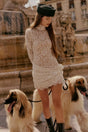 The De La Vali Bodita Mini Dress features a high scalloped neckline, fitted flared sleeves, and a draped waist with a rose appliqué, layered over a nude mini slip for a romantic, sculpted silhouette.