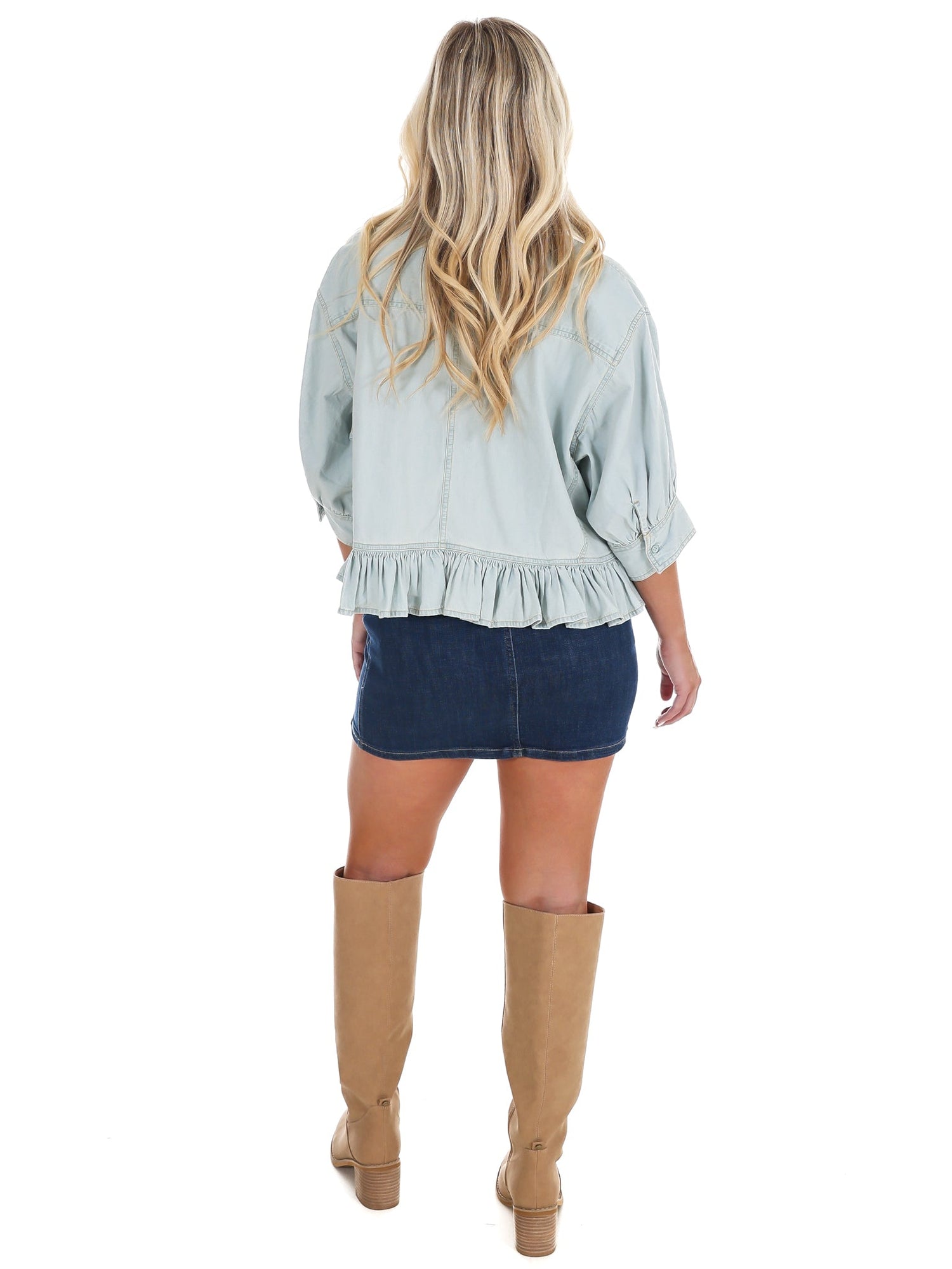 A classic denim shirt with a little something extra, featuring a ruffled hemline and short balloon-style sleeves.