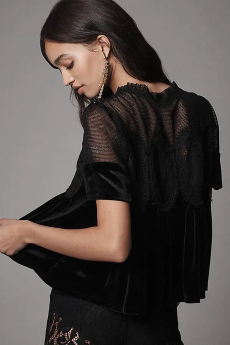 Anthropologie EN ELLY Velvet Scallop Top - Black Size: L