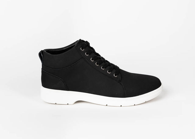 High Top Sneaker; A sharp high top sneaker with a sophisticated notch heel and minimalist pattern. The combination of the white sole and unique matte surface on the black leather elevates this sleek look above all other black sneakers. A beautifully crafted athletic shape is complimented with leathers of full and top grain and an all-rubber sneaker outsole for maximum comfort and durability.