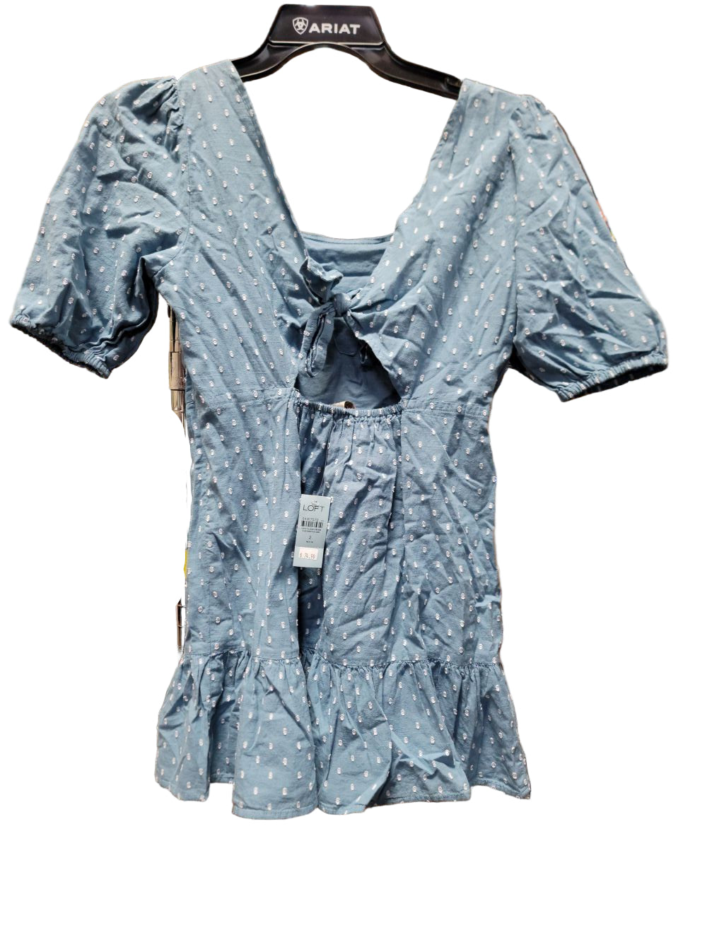 LOFT Blue and White Polka Dotted Summer Mini Flare Dress, Size 2P is backordered and will ship as soon as it is back in stock.