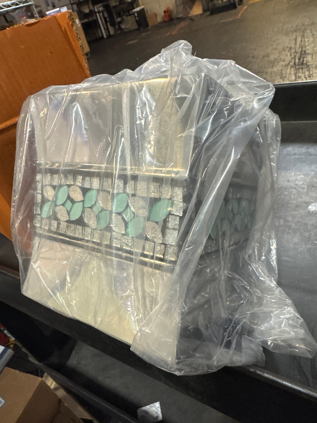 nu steel SF9H Sea Foam Collection Curved Shape Paper Facial Tissue Box Holder for Bathroom Vanity Countertops, Bedroom Dressers, Nightstands, Desks and Tables, Aqua Finis, Mosaic Glass/Stainless Steel is backordered and will ship as soon as it is back in stock.