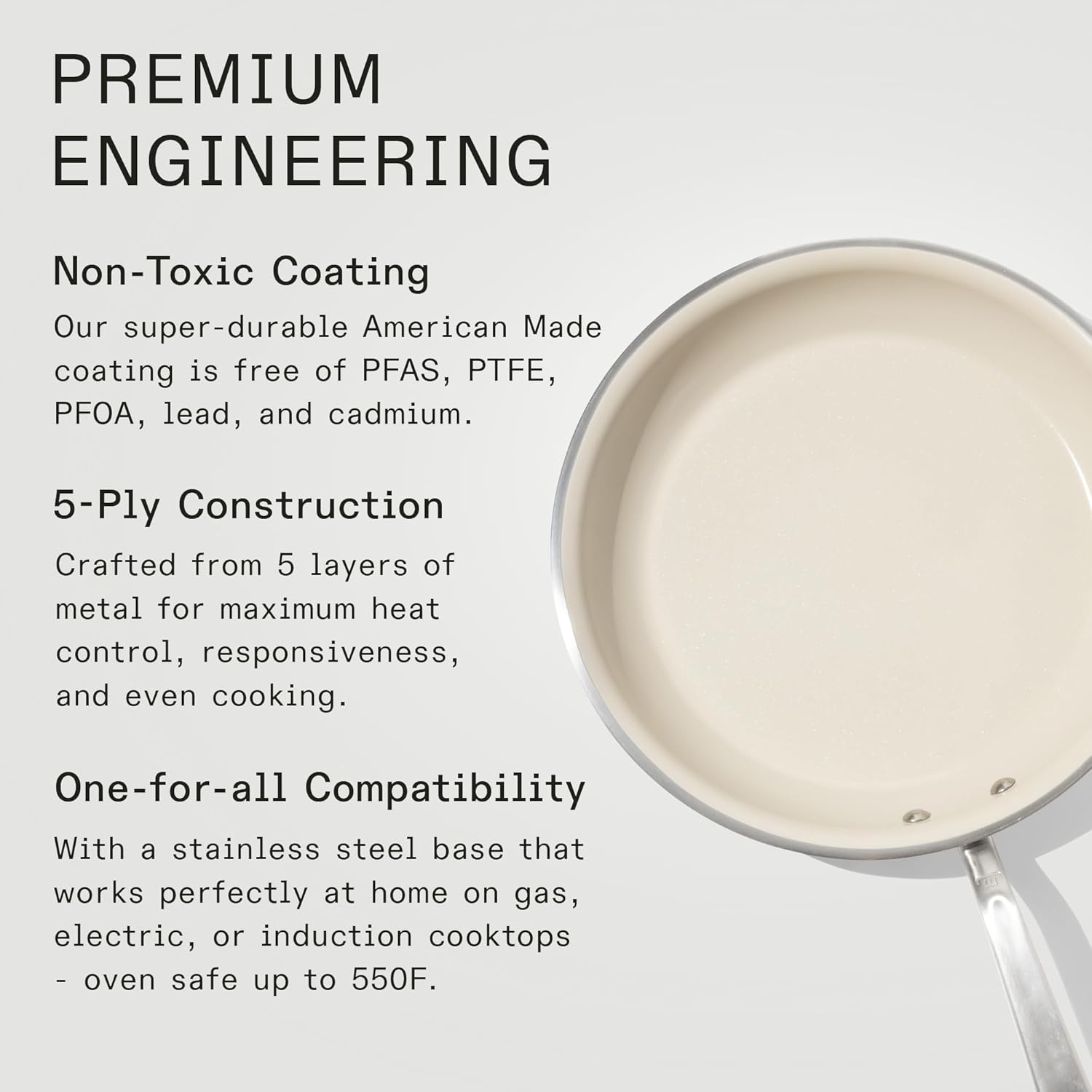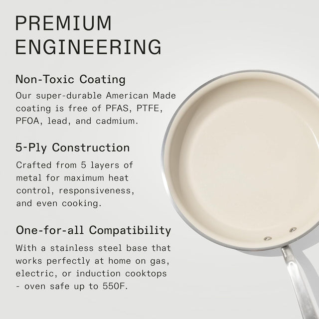Experience precise cooking with the Made In Cookware 12" Ceramic Non-Stick Frying Pan. Featuring a durable, toxin-free ceramic coating, it ensures safe and healthy meal preparation without PFAS, PTFE, PFOA, lead, or cadmium. Its premium 5-ply cladded construction offers superior heat control and consistent, even cooking. Oven safe up to 550°F and induction compatible, this pan adapts seamlessly to your kitchen needs. Crafted in the USA with imported components, it combines professional quality with lasting performance. The stainless steel handle provides a comfortable grip and added durability, making it an essential tool for any expert cook.
