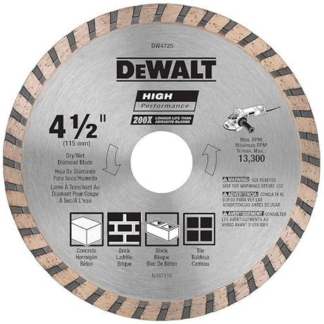 $612$1225Unit price /UnavailableDEWALT Diamond Blade for Masonry, Dry Cutting, Continuous Rim, 7/8-Inch Arbor, 4-1/2-Inch (DW4725)