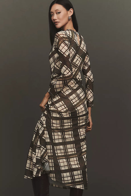By Anthropologie Long-Sleeve Ruched Mesh Midi Dress Brown Plaid Size: L