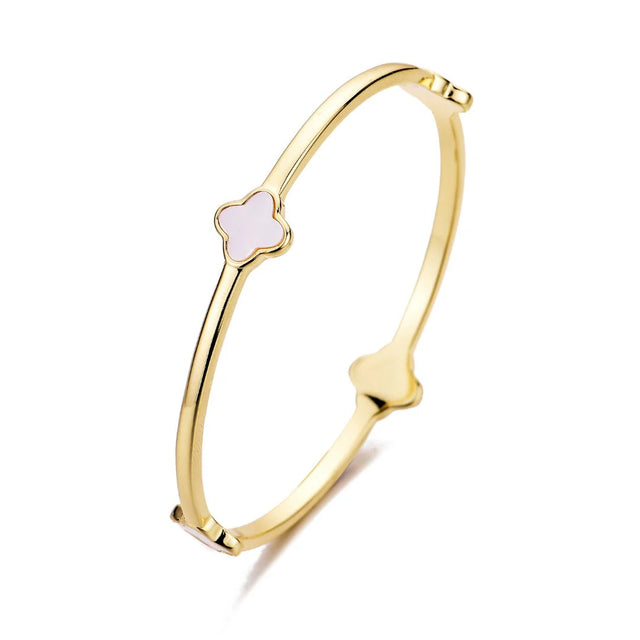 This 14k gold plated clover bangle offers a refined blend of elegance and symbolic charm. Crafted with a durable yet delicate design, its clover motif represents luck and positivity, making it a meaningful addition to any jewelry collection. The gold plating ensures a radiant finish that complements both casual and formal wear, while the bangle's comfortable fit makes it ideal for everyday use. This piece is expertly designed to provide lasting beauty with a touch of sophistication.