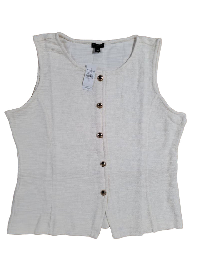 This sleeveless Ann Taylor Factory button-down in pale yellow combines sophisticated design with practical versatility. The cotton-polyester blend offers a structured yet breathable fabric that maintains its shape throughout the day, while gold-tone buttons add a refined finishing touch. The XL fit provides a tailored silhouette that works seamlessly layered or worn solo. Perfect for transitioning between seasons, this piece pairs beautifully with tailored trousers, skirts, or denim, making it an essential addition to any curated wardrobe.