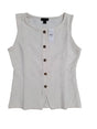 This sleeveless Ann Taylor Factory button-down in pale yellow combines sophisticated design with practical versatility. The cotton-polyester blend offers a structured yet breathable fabric that maintains its shape throughout the day, while gold-tone buttons add a refined finishing touch. The XS fit provides a tailored silhouette that works seamlessly layered or worn solo. Perfect for transitioning between seasons, this piece pairs beautifully with tailored trousers, skirts, or denim, making it an essential addition to any curated wardrobe.