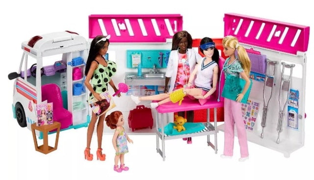 The Barbie Care Clinic playset lets kids explore their nurturing side as a care clinic medical professional. The Care Clinic vehicle transforms from a Barbie ambulance, complete with lights and sounds, into a doctor's office with an exam room and exam table, check-in station and waiting room. More than 20 accessories inspire imaginations to care for patients and play out nurturing stories. Doll not included.