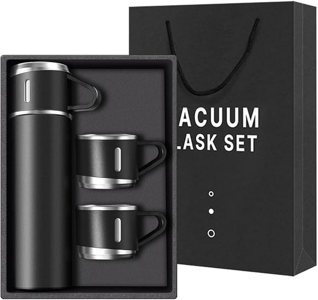 BLACK SET-Coffee Thermos Stainless Steel Vacuum-Insulated Water Bottle, 500ml/16.9oz Insulated Bottle with Cup for Hot & Cold Drink Travel Mug (Black, Three Cup)