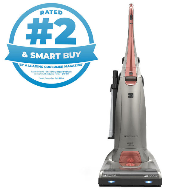 Get rid of pet hair, dust, allergens and more with the Kenmore Elite direct drive 3-motor bagged upright vacuum. After sweeping through the house with this easy-to-use vacuum, you can take a deep breath of fresh air. The AllergenSeal™ system ensures the air you breathe stays clean, filtering 99.97% of particles down to 0.3 microns. Kenmore’s most powerful motor, the Inducer Motor, has 20% more airflow* creating strong suction for excellent deep carpet and bare floor cleaning performance. Combined with Power Flow Technology, a double-wall design, your vacuum keeps air flowing to maintain suction and performance even as the bag fills. Effortlessly transition to above floor cleaning with 10’ of extended reach with the telescoping wand or pick up stubborn pet hair from stairs with the Pet HandiMate® attachment tool. Dirt has nowhere to hide between the headlight and LED dirt sensor, which alerts you to dirt you can’t see so you always know when an area is truly clean.