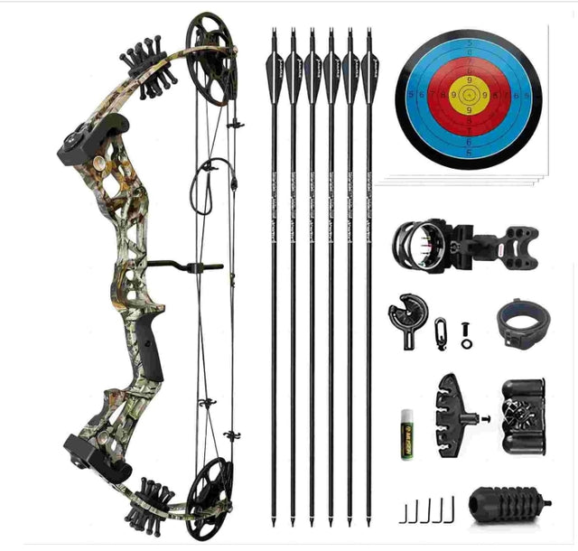 - PACKING LIST: Hunting Compound Bow、3-Pin Compound Bow Sight、Whisker arrow test 、Rubber Stabilizer 、Peep Sight 、Wrist Sling 、Arrow Quiver 、Allen Key、 Wax 、 4xTarget sheet、6xCarbon Arrows