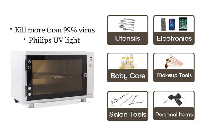 The Derma logic Sterilizer comes in a compact 14-inch long by 9-inch wide by 9.5-inch-high design to fit in a small salon. You have two shelves to hold combs, scissors, cuticle pushers, and other hair and nail tools. The UV germicidal lamp sterilizes all your equipment to take away your customer's concerns about spa and salon equipment. You can even see your tools through the door as they sterilize, and the machine turns off when you open the door. Keep your small salon up to health and safety standards with this compact, low-cost option.