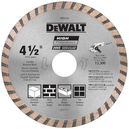 DEWALT Diamond Blade for Masonry, Dry Cutting, Continuous Rim, 7/8-Inch Arbor, 4-1/2-Inch (DW4725)