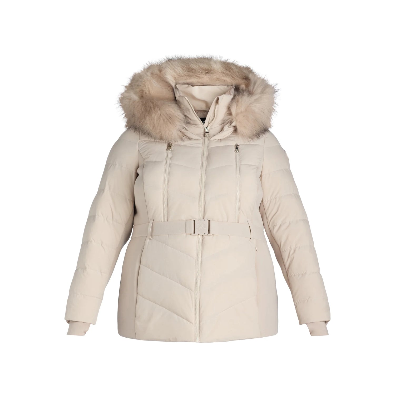 - Features: Water resistant; detachable faux fur at hood; side stretch knit panels; removable elastic belt; lined