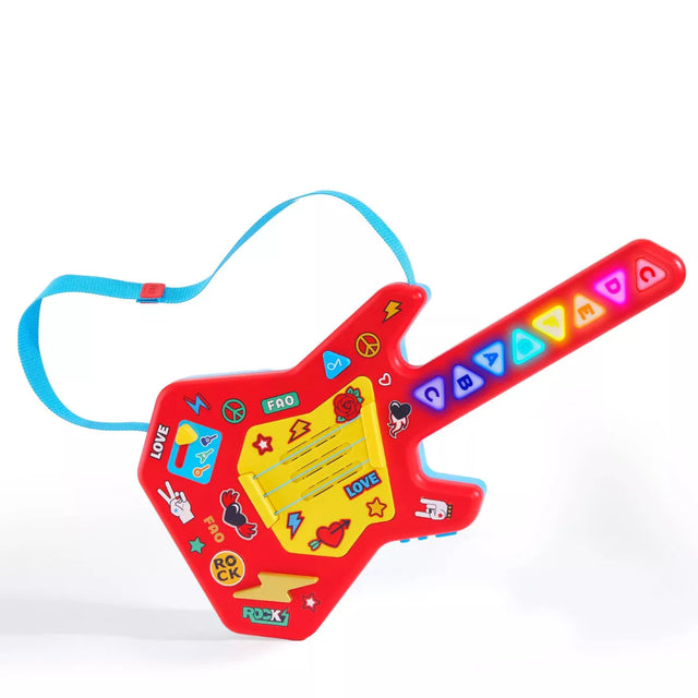 Encourage your little one's musical talents with the F.A.O. Schwarz® Stage Stars™ Interactive Guitar with Whammy Bar. Designed for children aged 2 and up, this guitar makes it easy for budding musicians to start rocking with a simple push-button interface. Kids can choose from three different music modes—acoustic guitar, electric guitar, and banjo—to discover a variety of sounds. The guitar includes 30 demo songs that provide plenty of options for play-along fun, helping to develop rhythm and musical skills. Additionally, the guitar comes with two sticker sheets, allowing young rockers to customize their instrument for a personal touch. The interactive whammy bar adds another layer of excitement, letting kids explore all 8 chord ranges with dynamic sound effects. Whether practicing solo or performing a concert for family, this interactive guitar is sure to inspire creativity and a love for music.