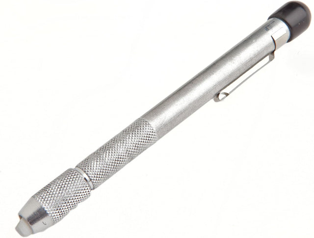 1/4" Round Aluminum Soapstone Pencil Holder, constructed with an inner sleeve collet to separate the soapstone for maximum grip and protection. Slim line brass holder with a convenient deluxe pocket clip. Easily adjustable.