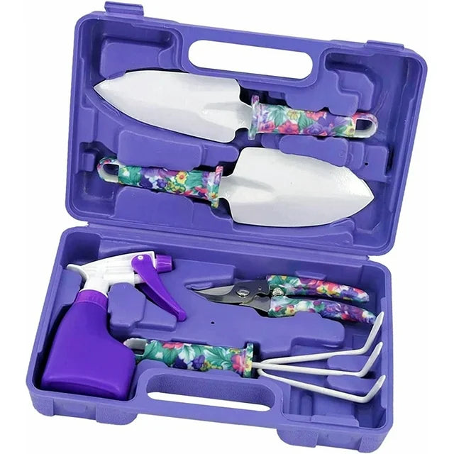 GoXteam Garden Tools Set, 5 Pieces Gardening Tools with Purple Floral Print, Including Non-Slip Rubber Grip, Anti-Rust Trowel, Cultivator, Pruning Shear, Water Sprayer and Case, Great Gift
