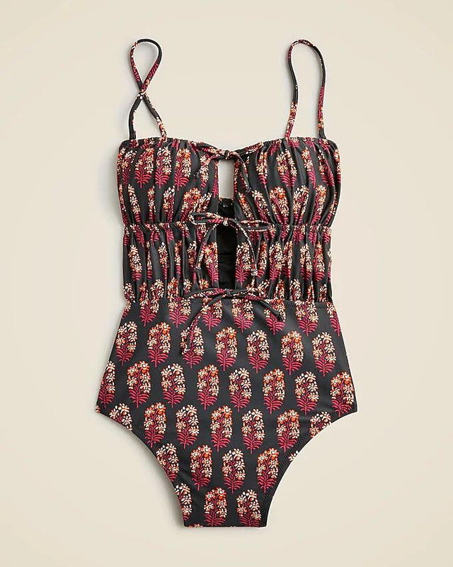 This J. Crew one-piece swimsuit features a vibrant green background adorned with red, orange, and white floral patterns. Designed with removable straps and a tie-front detail, it offers customizable support and a flattering fit. Crafted for both style and function, this swimwear piece combines classic charm with modern versatility, making it ideal for a confident, polished look at the pool or beach.