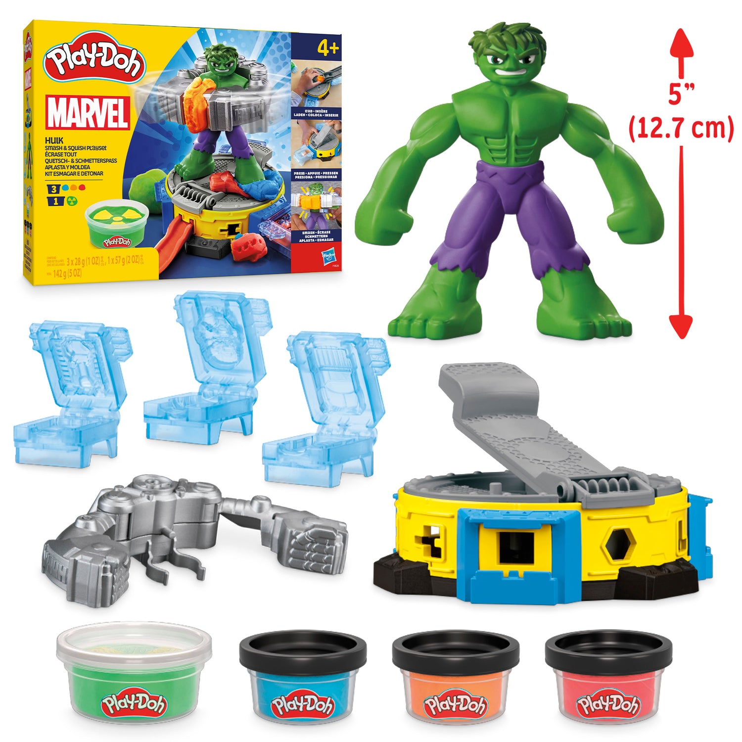 - BENDY ACTION FIGURE WITH POWER SUIT: Awesome, bendy 5-inch (12.7 cm) Hulk action figure can wear the Hulk Hands suit for super Play-Doh smashing power