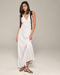 A beautiful white slip dress complete with a black contrast tie shoulder design. An easy maxi style to dress up or down.