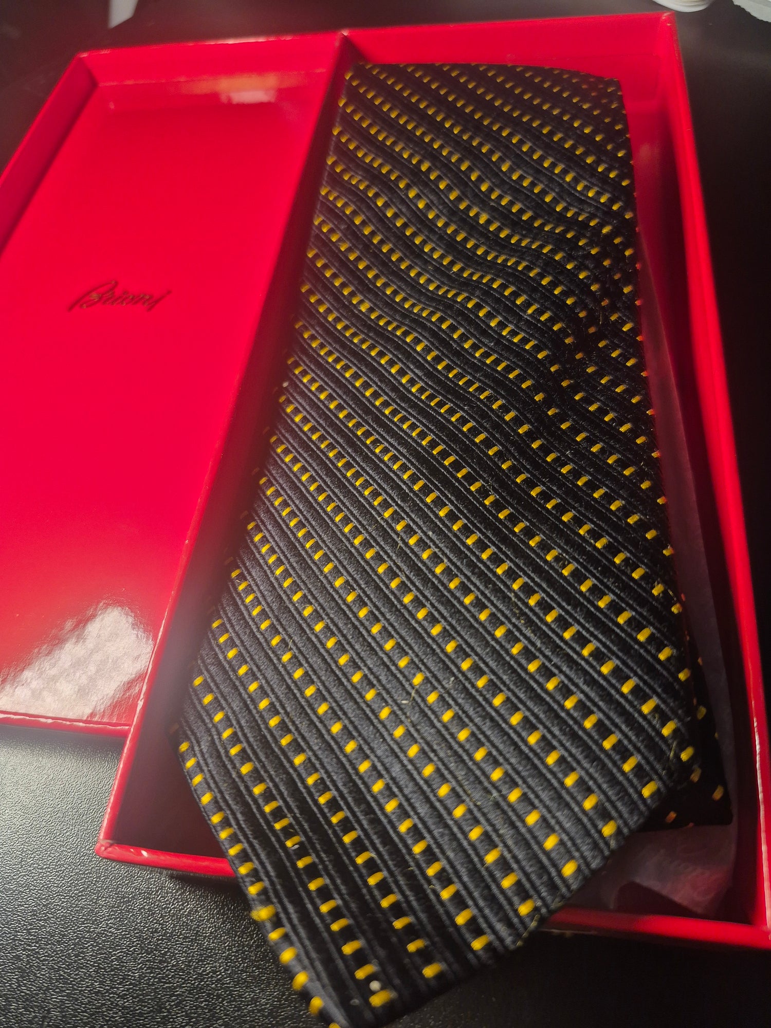 Vintage Brioni Tie-100 % Silk- Black With Gold Stitching- Geometric Diagonal Dash Pattern is backordered and will ship as soon as it is back in stock.