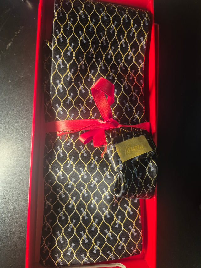 Vintage Brioni Tie 100% Silk Black Background, Gold, And Silver, Repeating Pattern Columns