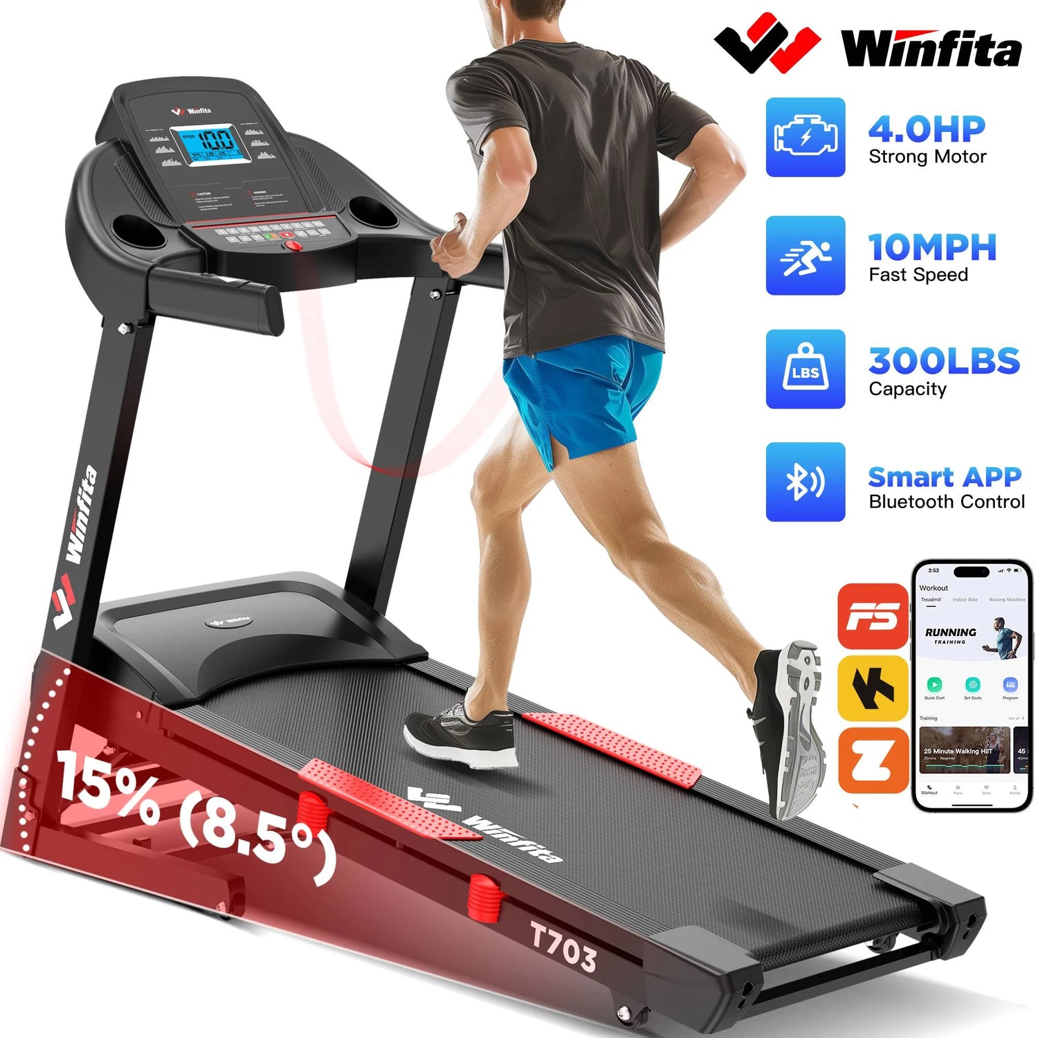 - BUILT FOR PERFORMANCE - Compared to other ordinary treadmills, Winfita New Version App treadmill highlights 15 Levels Incline(The incline angle can reach up to 8.5°), 18"W*50"L Thickened Running Belt with Shock-absorbing Cushions, 4.0HP Motor, Double Control Ways: Console Control/App Control, Bulit-in Bluetooth Speakers, Built-in device holder & USB Charging & Dual Item Holders, 64 +5+1 Programs & 3 Modes, Up to 16KM/H(10MPH) Adjustable Speed, 300LB Max Capacity, Easy Folding & Space Saving, such an outstanding comprehensive APP folding treadmill to meet all your needs.